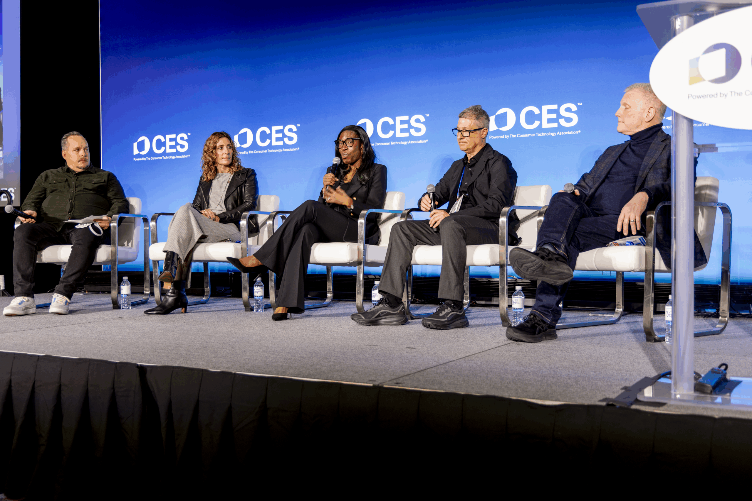 Five people sit on a stage in front of a blue CES backdrop, participating in a panel discussion. One person speaks into a microphone while the others listen. Water bottles are placed beside each chair.